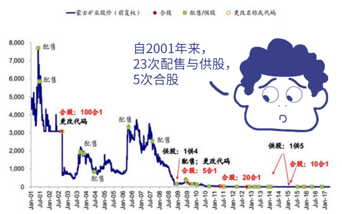 蒙古矿业在2008-2015年期间,一共进行了多次的合股和低价供股。例如,09年的1月9号,蒙古矿业股价跌至0.05元,先前的600万本金已剩下不足80万。不过由于股民仍坚信股票会反弹,而且跌幅太深,割肉太痛,就顺势“装死式”继续持有。此时,公司宣布低价供股,供股价为0.027元,折价46%,1股供4股。