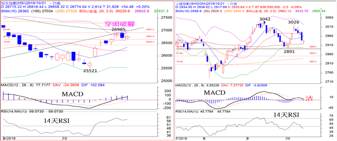 結果,恆指在10月16日收市升穿了0.618倍反彈阻力位26661之後,10月18日最高曾升至26985,剛好升抵上述的阻力密集區,之後恆指迅速掉頭回落,最終以「穿頭破腳」的見頂形態低收,表示26985有條件成為一個短期頂部。不過,除了MACD維持買入訊號之外,恆指暫時仍獲得27366至25521跌幅的0.618倍反彈目標26661所承托,如果保持其上收市,則表示升勢不變,整固後可以再破頂。相反,如果確切跌穿26661低收,即確認26985為短期頂部,及後出現較大幅度的調整。