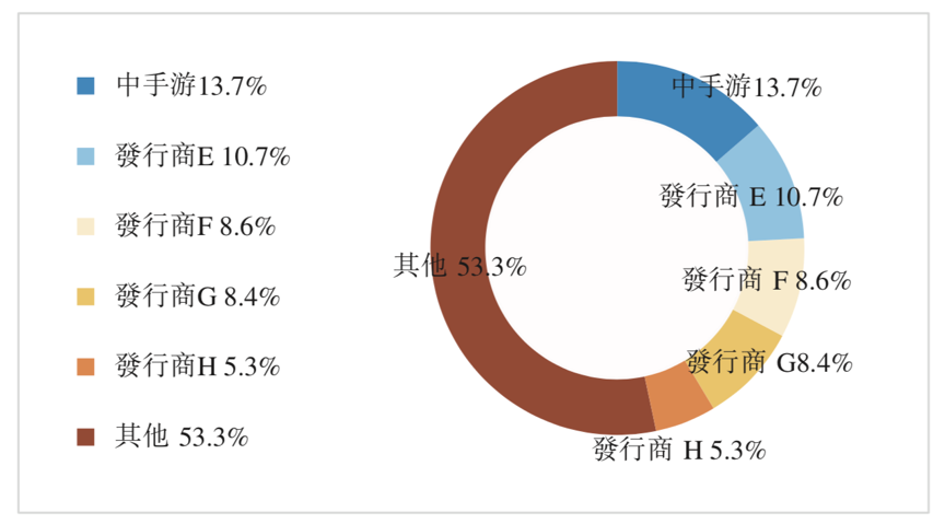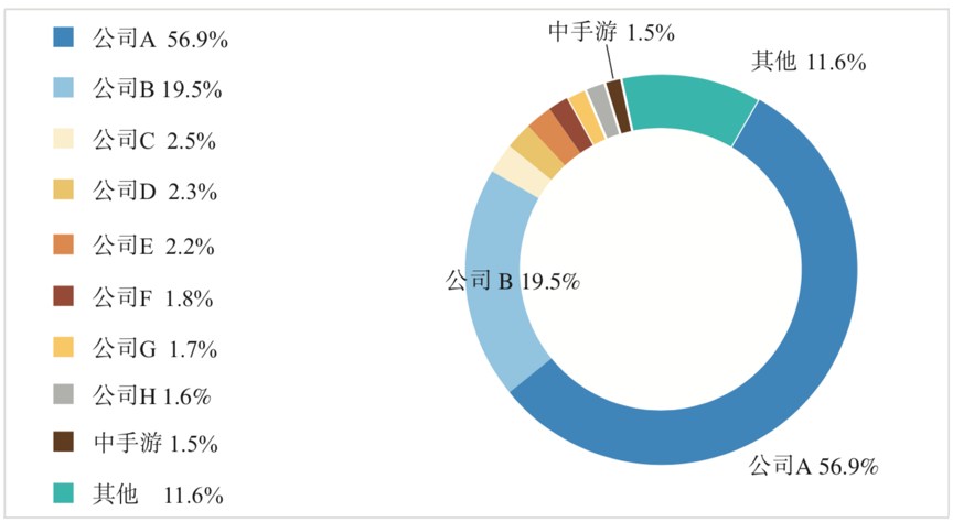 就竞争格局而言,中国手游市场集中度较高,其中仅A公司及B公司便占据76.4%的市场份额,而中手游市场份额仅1.5%,目前排名第9。
