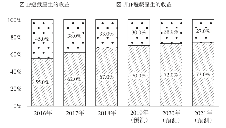 公司所处的IP手游细分市场重要性逐步上升。2018年,IP手游产生的收益达到972亿元,占手游市场的67%,预计2021年收益将增长至1679亿元,复合年增长率为20%,占手游市场总营收比例达到73%。