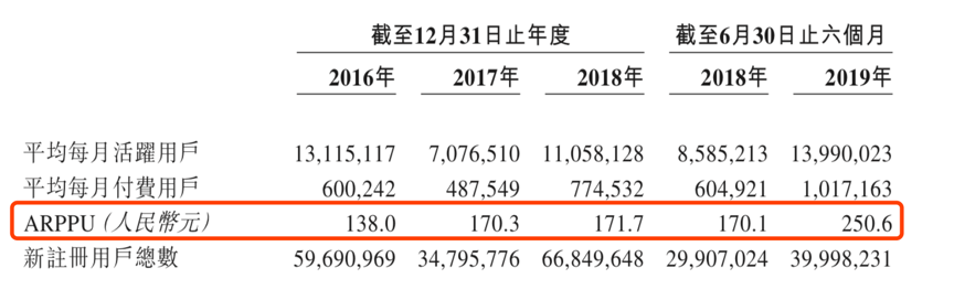 公司近年营收呈大幅上升趋势,17年和18年营收分别为10.13亿和15.96亿人民币;19年上半年营收15.29亿人民币,同比增长127.5%。主要原因是付费用户的提升,下图可见公司的月平均付费用户从18年的60.4万增长至2019年上半年的101.7万。此外,在用户数量快速扩张的基础上,平均每用户付费金额仍保持增长态势,其ARPPU由2018H1的170.1元增长至2019H1的250.6元。