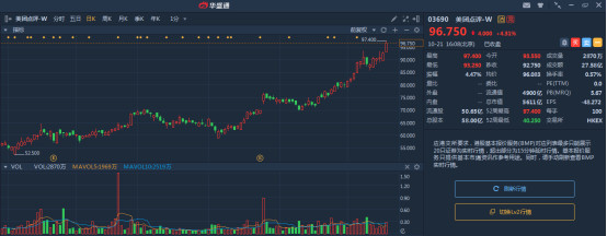 与小米一样在2018年登陆港股的美团点评,在10月21日同样股价飙涨,盘中一度触及97.4港元的历史最高位,截止收市美团涨逾4.31%,市值达5611亿港元。