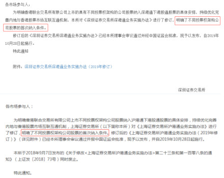 在10月18日,上交所和深交所同时宣布修订并发布沪深港通业务实施办法,明确了不同投票权架构公司股票的首次纳入条件。修订后的《实施办法》自2019年10月28日起施行。这也意味着,港股市场上同股不同权的上市公司小米集团和美团点评将被纳入港股通范围,可以接受南下资金购买。