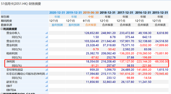 由于盈利模式不清晰开始并不被投资人看好。51信用卡财报显示,公司在2019年上半年的净利润仅为1.84亿人民币,同比暴跌高达91%。而在2015年~2017年,51信用卡则均处于亏损状态,净利润分别为-7亿、-22.31亿,以及-13.7亿元。也就是说,短短3年时间,51信用卡亏出43亿人民币。