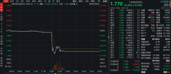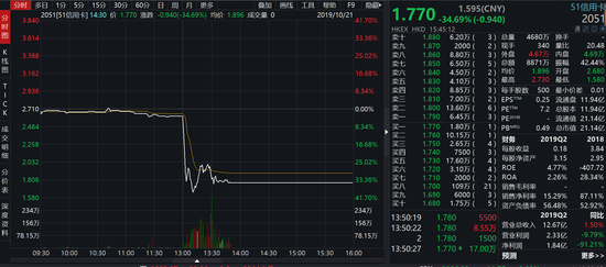 公司新闻震惊了市场,公司股价午后闪崩,一度暴跌40%。随后,51信用卡宣布,公司的股份已于10月21日下午1时50分起短暂停止买卖,停牌前跌幅收窄至34.69%,最新市值21亿港元,11亿市值蒸发。
