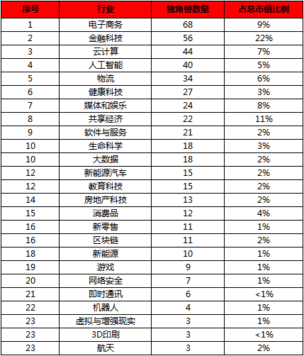 从独角兽企业所属行业来看,排名前五的是电子商务、金融科技、云计算、人工智能和物流领域。其中电子商务企业数量最多,有68家,金融科技企业占总市值比重最多,占比22%。