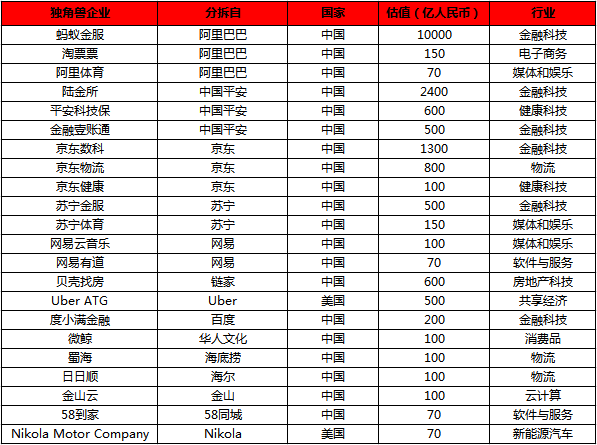 有趣的是这20家分拆而来的独角兽企业中,有18家是中国企业,其中阿里巴巴、中国平安和京东各剥离了3家独角兽,苏宁和网易各2家。