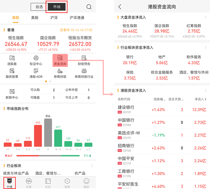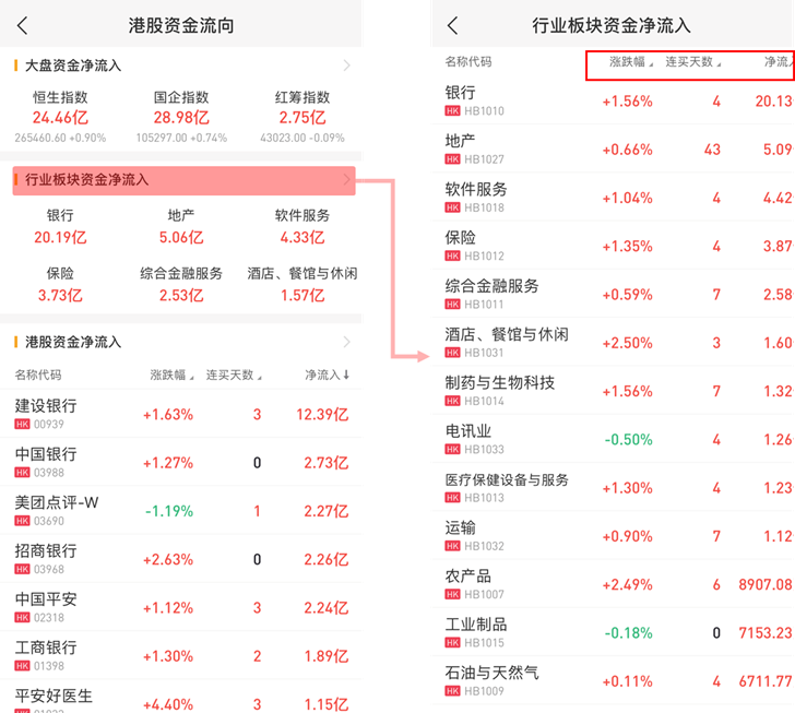 页面分为3大块,包括大盘资金净流入、行业板块资金净流入和港股资金净流入,红色为流入,绿色为流出。