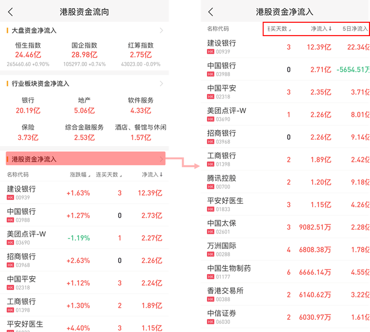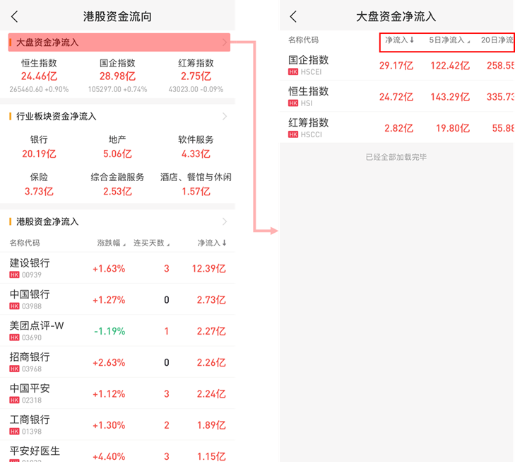港股资金净流入:列举了当前市场全部股票的资金流入情况,默认按照净流入的金额进行排序,点击进入详情页后,即可根据不同的维度进行排序。