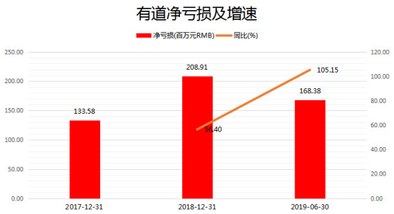 从净利润来看,网易有道目前仍是亏损状态。2017年、2018年以及2019年上半年网易有道净亏损为1.34亿、2.09亿以及1.68亿元,2018年和2019年上半年同比增速分别为56%和105%。亏损增速明显高于营收增速。