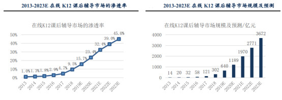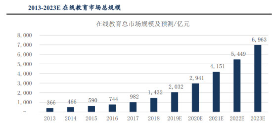 根据Frost & Sullivan数据显示,2018年中国在线教育市场总规模为1432亿元,2013年至2018年,复合增长率高达31.4%。而该机构预测在2018年至2023年该市场年复合增长率还会上升至37.2%,2023年全市场规模将达到6963亿元。
