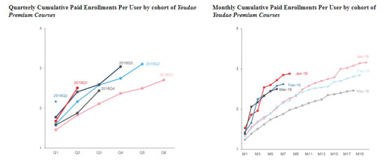 下图展示了有道每个阶段注册的学生群体,其累计注册课程数的增长情况。可以看到随着时间的推移,续班及复购效果更好,成长曲线更加陡峭,这也表明有道在整个报告期内回购率和学生参与度及忠诚度不断提高,交叉销售能力不断增强。