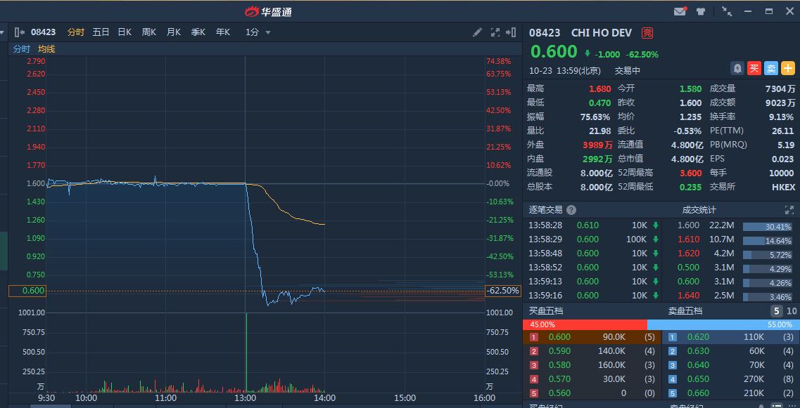 智通财经APP获悉,创业板CHI HO DEV(08423)午后惨遭洗仓,股价高位跳水暴跌70%。截至14时00分,跌62.5%,报价0.60港元,成交额9023万。值得注意的是,该股此前三个交易日累计涨幅超130%。