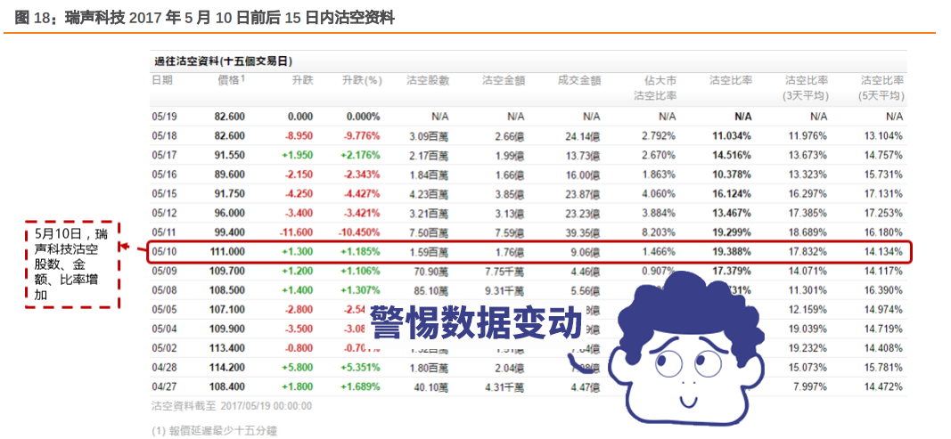 比如在2017年5月10日瑞声科技的沽空股数、沽空金额、沽空比率开始大幅增加,之后沽空机构就在5月11日对它发布了做空报告。所以对于这些异动数据,投资者应高度警惕。