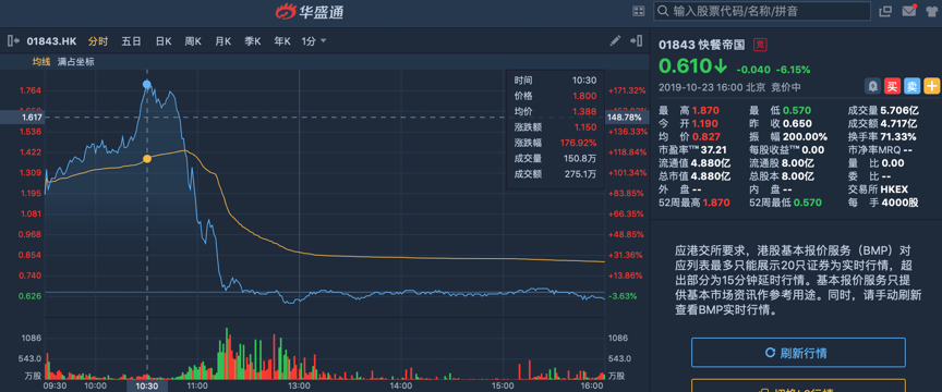 快餐帝国在港市交易的第一日即经历了从暴涨近180%到破发的巨幅波动。早上先从83%的巨幅高开,一路高走,最高涨幅177.7%,报1.87港元每股,随后却迎来直线跳水,直接回到此前0.65港元发行价附近后开始企稳,最终收盘仍破发6.15%,报0.61港元。假如有投资者在顶部追涨买入,那么目前的亏损幅度已超65%。