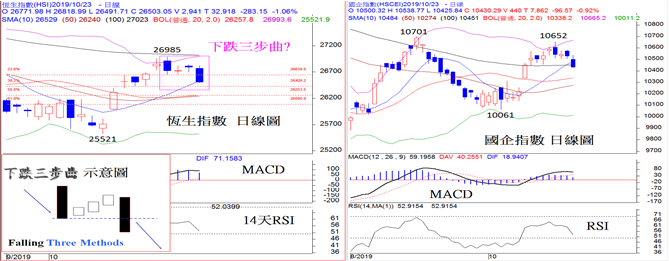 另外,以陰陽燭形態分析,恆指除了在26985以「穿頭破腳」見頂之外,如果今日最終以陰燭保持在上周五的陰燭底26650之下收市,則確認日線圖上呈現類似「下跌三步曲」的利淡形態,預示跌幅會繼續擴大。典型的「下跌三步曲」是:先出現一支大陰燭,然後出現連續三天的小幅反彈,但不高於大陰燭的頂部,接着出現第二支大陰燭,其收市價低於第一支的大陰燭底部之下。雖然恆指今次的反彈只有兩支蠟燭,而不是典型的三支,但整體的利淡意義是相同的。