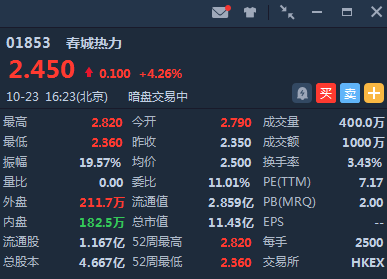 春城热力暗盘高开18.72% ,截止16:22,暗盘段报2.45港元,较发行价2.35港元涨4.26%。