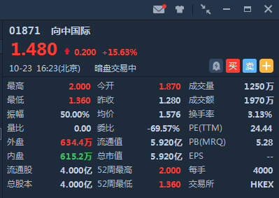 向中国际暗盘高开46.09%,截止16:22,暗盘段报1.48港元,较发行价1.28港元涨15.63%。