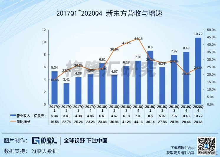 新东方FY2020Q1营收10.72亿美元,同比增长了24.60%,该增速属于正常的增速区间内,环比有所回升,同时也位于之前业绩指引的上沿。