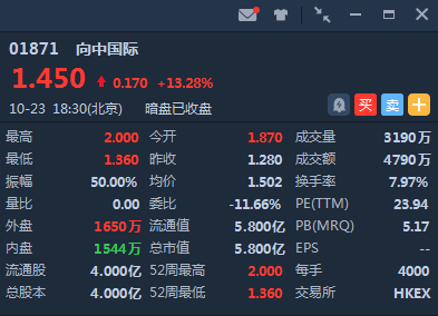 向中国际今日暗盘收报1.45港元,较发行价1.28港元涨 13.28%,每手赚680港元,成交额4790万港元,总市值为5.8亿港元。