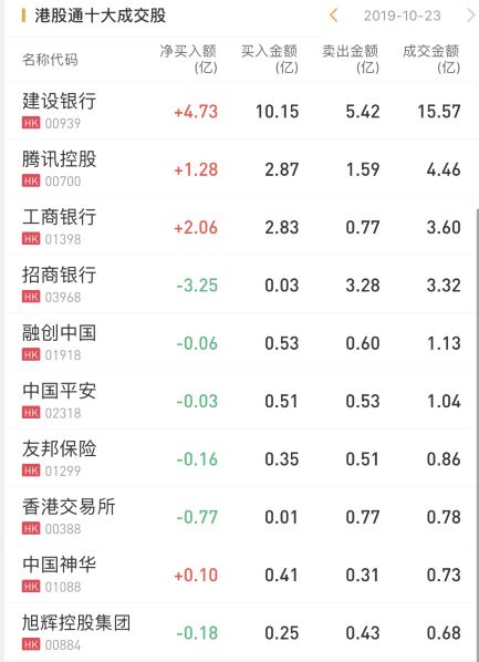 港股通资金今日净流入港股11.93亿港元。今日净买入建设银行4.73亿港元,净买入工商银行2.06亿港元,净买入腾讯1.28亿港元。