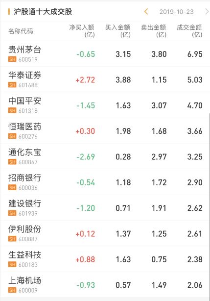 北上资金今日净流出10.03亿元。沪股通净买入华泰证券2.72亿元,净买入生益科技0.88亿元;净卖出通化东宝2.69亿元。