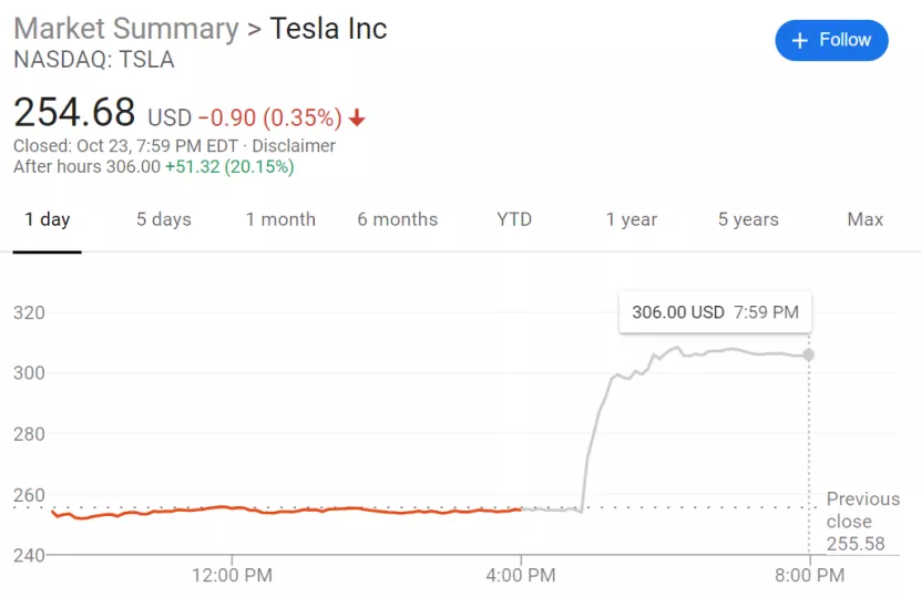 在北京时间24日早间的美股盘后交易时段,特斯拉公布第三季度季报,股价应声大涨21%。
