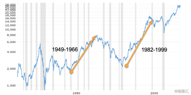 与此相伴,道琼斯指数在第二次世界大战后走出了两个长达17年的大牛市: