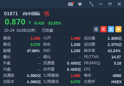 向中国际首日挂牌港交所,截止收盘跌32.03%,报价0.87港元,若以发行价1.28港元买入,一手蚀1640港元,成交额2.078亿港元,市值达3.48亿港元。
