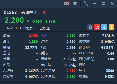 春城热力首日挂牌港交所,截止收盘跌6.38%,报价2.20港元,若以发行价2.35港买入,一手蚀375港元,成交额1.649亿港元,市值达10.26亿港元。