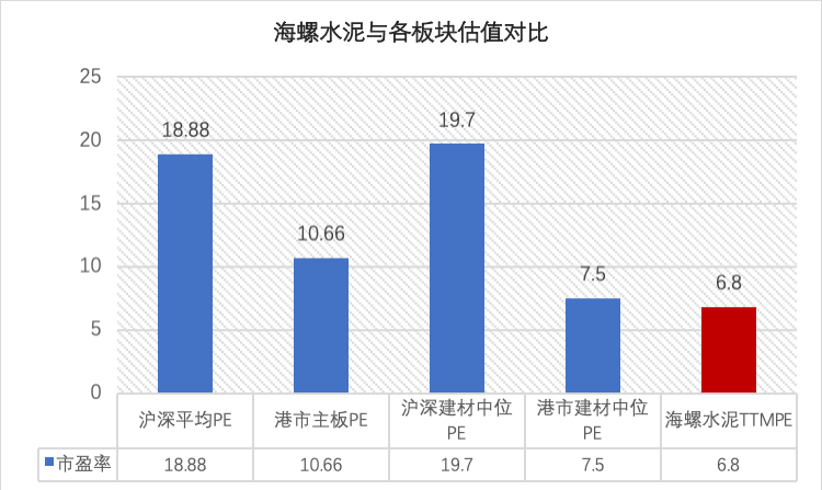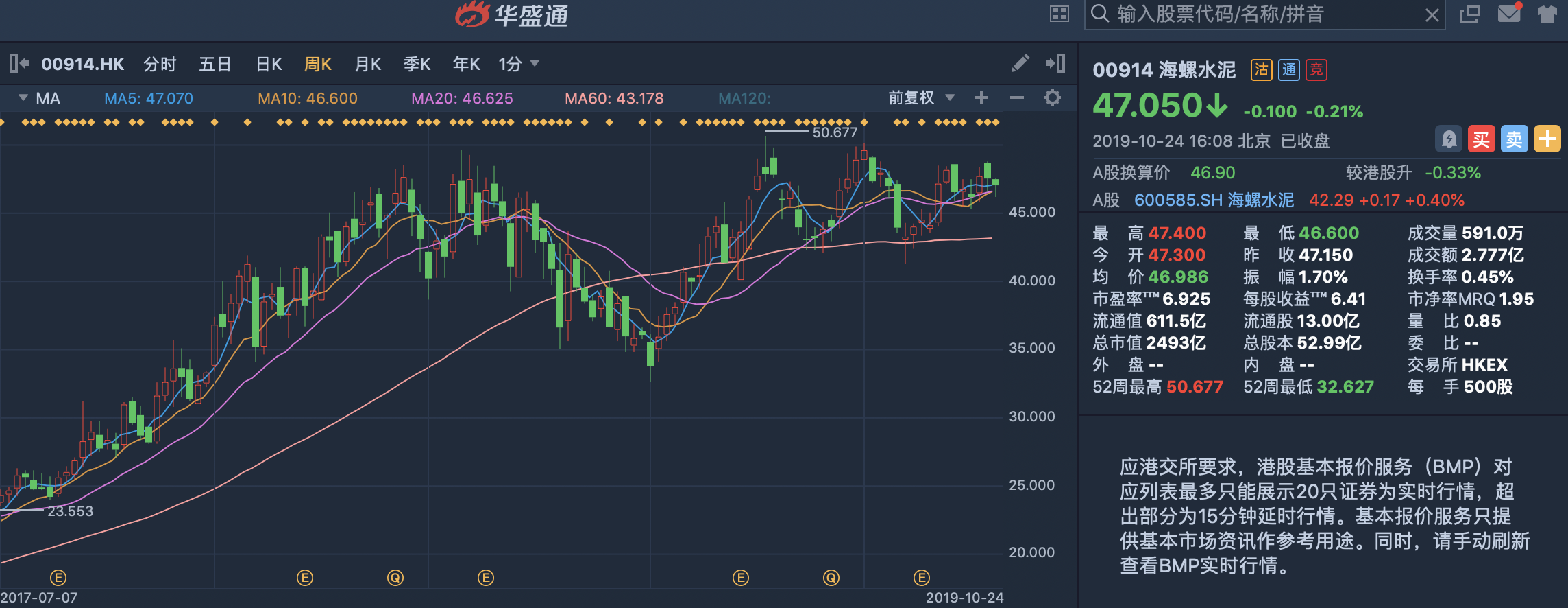 以2019年10月24日收盘价47港元计算,海螺水泥当前的TTM市盈率为6.8倍,股息率为4.09%。相比之下,港市主板平均市盈率为10.66倍,平均股息率3.27%;沪深两市平均市盈率为18.88倍。明显低于主要市场平均估值水平。