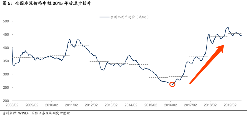 就水泥价格而言,2015年后全国水泥平均价开始全线回暖,由不足300元/吨的均价逐步反弹至450元/吨左右,并在近两年维持高位震荡波动格局。
