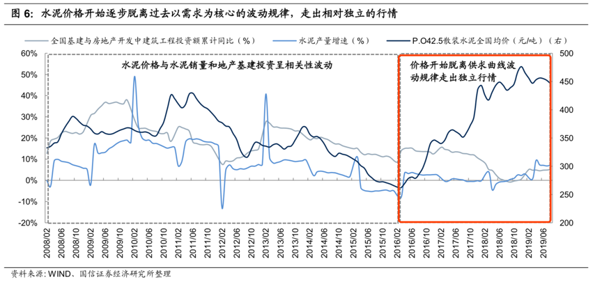 根据国信证券水泥行业研究报告,中国目前的水泥价格开始逐步脱离过去以需求为核心的波动规律,走出相对独立的行情。下图为水泥价格、水泥销量及地产基建投资的相关性统计图,可见自2015年供给侧改革后,水泥价格开始脱离供给曲线波动规律,并走出独立行情。