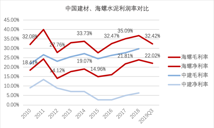 此外,与水泥建材同行公司的对比,亦表现出更加优秀的盈利能力。下图中,海螺水泥的毛利率、净利率水平均要大幅高出中国建材,反映出的是行业内海螺水泥卓越的经营战略和运营水准。