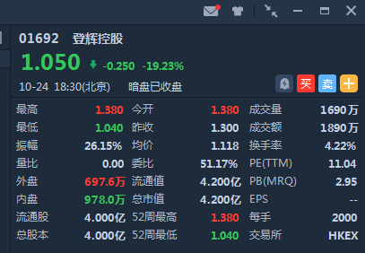 登辉控股今日暗盘收报1.05港元,较发行价1.30港元跌19.23%,每手蚀500港元,成交额1890万港元,总市值为4.2亿港元。