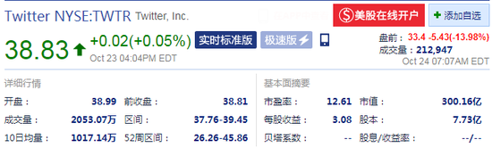 财报公布后,推特股价盘前跌近14%。