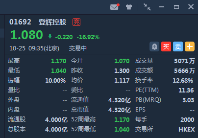 登辉控股首日挂牌低开17.69%,截至9时36分,跌16.92%,报价1.08港元 ,成交额5666万港元 ,最新市值4.32亿港元。