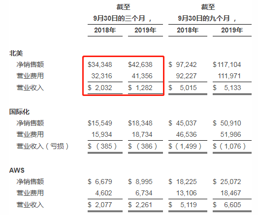 从分部业务来看,亚马逊第三季度利润下滑主要来自北美业务的压力,由于将Prime会员送货时间从2天缩短至1天,北美电商业务销售额增长了24%,但营业成本增长了28%,使运营利润从去年同期的20.3亿美元直降至12.8亿美元。