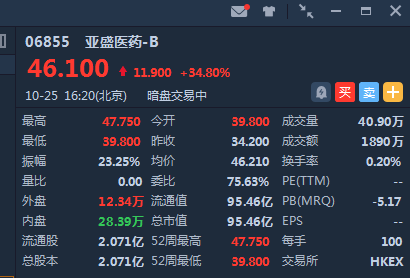 亚盛医药-B暗盘高开16.37% ,截止16:20,暗盘段报46.10港元,较发行价港元涨34.8%,暂成交1890万港元,最新总市值95.46亿港元。
