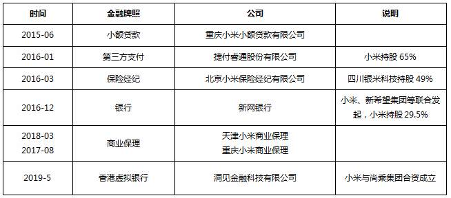 小米对外投资事件共212起,投资总额约254亿人民币。目前,小米金融以贷款和第三方支付为核心业务,已发行111亿元ABS,并拿下保险、保理、银行等多块金融牌照,基本实现全牌照布局。除与新希望等联合发起新网银行外,小米还获得香港虚拟银行牌照,预计2019年底上线业务。