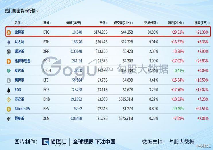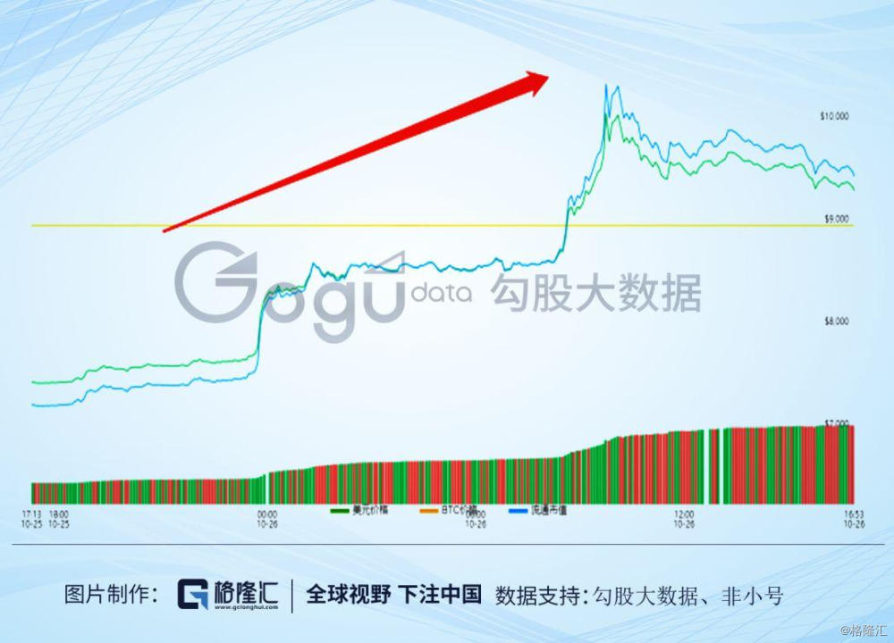 与此同时,主流的数字货币市场亦集体大幅上扬,热门加密货币几乎全线飘红。而作为带头大哥的比特币更是一路高歌猛进,据非小号数据显示,比特币于北京时间26日早晨迅速突破10000美元,且一度涨超50%,截至2019年10月26日晚12点,报价约9185美元/币,逆转近日来的下跌颓势。