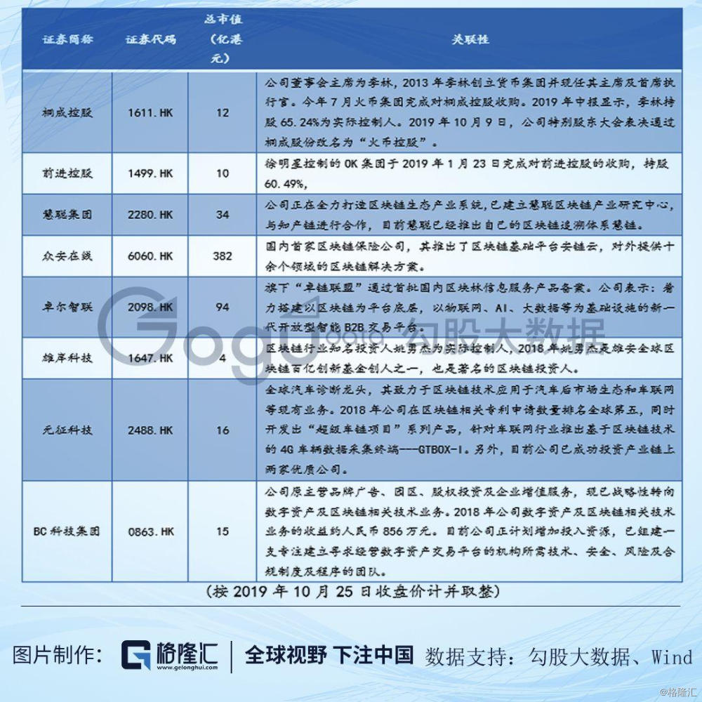 在美、A股市场相关板块蠢蠢欲动之际,港股在下周一开盘的表现亦备受市场期待。而至于相关标的,除了腾讯控股(0700.HK)、各大银行、中国移动(0941.HK)、小米集团(1810.HK)这些在技术应用领域布局的巨头之外,目前港股市场还有一些较为纯正的区块链标的,笔者经过简单整理如下,以供参考: