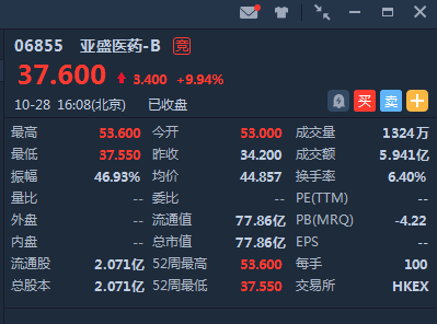 亚盛医药-B首日挂牌港交所,截止收盘收窄至9.94 %,报价 37.6港元,若以发行价34.2港元买入,一手赚340港元,成交额5.941亿港元,市值达77.86亿港元。