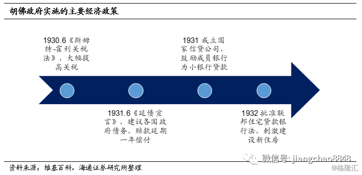 政策变化:政党轮替、财政扩张。以邻为壑,终究徒劳。1930年起美国进口增速连续三年降幅高达30%以上,美国经济增速1930年开始负增,1932年GDP实际同比接近-13%。全球贸易额在1930-34年间持续萎缩,跌幅一度高达40%。错误的关税政策伴随了美国的整个大萧条阶段。直到1933年美国的进出口增速才重新转正,这一年罗斯福出任总统,之后一年,通过《1934 年互惠贸易协定法》,赋予总统贸易领域更高的权力,美国此后十多年间与约30个国家签订互惠贸易协议,整体关税水平下降,并借此恢复和打开了国外市场。当时美国政策整体从放任自由的小政府模式,转向了加强干预的大政府。1920年代美国几乎完全处在共和党的执政中,信奉“放任自由”和“保守主义”。而民主党的罗斯福主张对经济加强干预,新政的核心“救济、复兴、改革”都具有加强政府干预的色彩,加大财政刺激,并出台救济穷人和失业者的措施。1920年代美国忽视了贫富失衡,而要缩小贫富差距,需要政府调节分配,这也就是胡佛黯然收场、而罗斯福新政登台的必然。