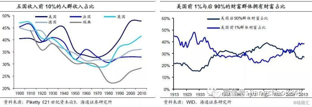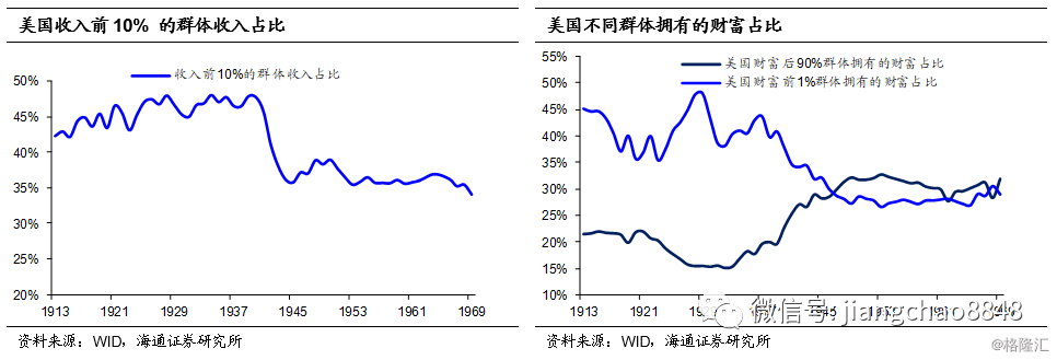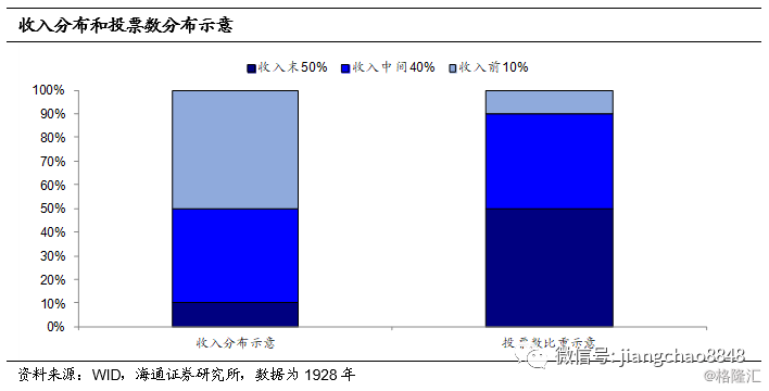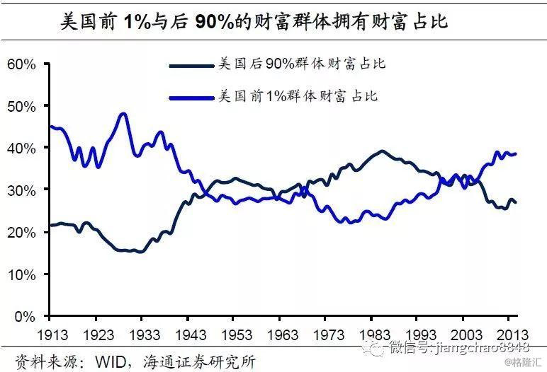 而财富和分配的失衡,反过来又进一步激化了社会层面的矛盾,助涨“民粹主义”。在经济陷入大萧条之后,分配失衡导致中低收入者群体庞大,使得他们成为了美国社会的“中间投票人”,对政治选举起到决定性的影响,而他们通常基于自身的考虑,对政府增加转移支付和提高福利有着更高的诉求。而贫富差距的扩大,中低收入者比重上升,这种诉求也就更强,政党想赢得选举,就要做出更符合这些投票人利益的承诺,往往在这种时候民粹主义就会开始回潮。