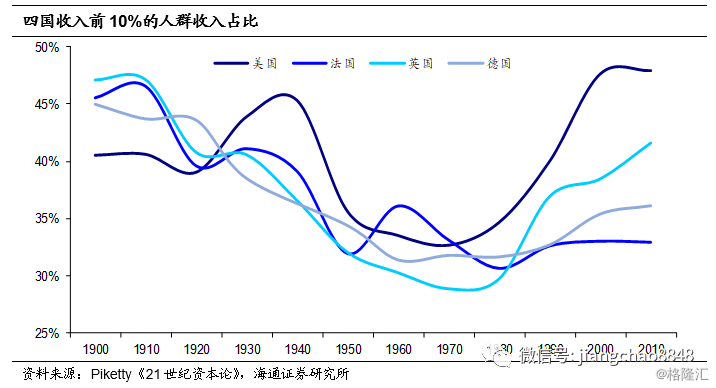 贫富差距扩大在当时也不是美国所独有的。在20世纪之初,法国、英国、德国等主要的欧洲国家也都经历了一段贫富严重分化的时期。1910年,这三国收入前10%的人群的收入占比都高达45%左右,虽然在1920年代有所下降,但到大萧条之前,这一比重也仍有40%。