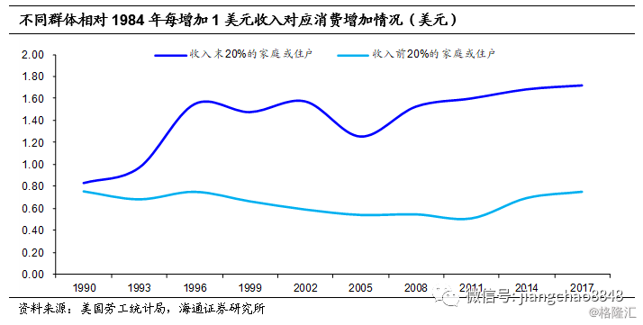 而贫富差距持续扩大,对经济的后果是抑制整体的消费,最终导致总需求不足。通常来讲,高收入群体的消费能力比较强,但是边际消费倾向较低;中低收入者边际消费倾向较高,但是消费能力受制于收入水平。根据美国劳工统计局的消费调查计算,以1984年的收支情况作为基准,到目前美国收入前20%的家庭或住户(consumer unit,即以1个家庭或者财务独立决策的住户作为调查中的1个消费单位consumer unit)收入每增加1美元,消费支出大约增加0.7美元左右,而收入末20%的家庭或住户,收入增加1美元,支出会边际上增加大约1.6美元(因为家庭或住户中存在不创造收入但有支出的群体,因而就调查单位而言会出现支出增加超过收入增幅的情况)。