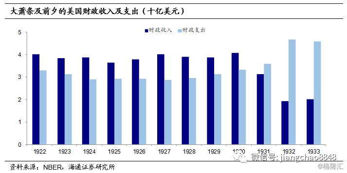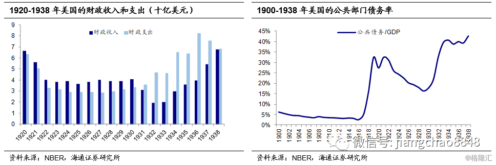 在大政府的理念之下,罗斯福时期的财政刺激力度加大。1933年后,美国政府一改1920年代坚持预算平衡、连年财政盈余的做法,采取扩张性的财政政策,加大政府支出。1935年左右,美国财政支出规模超过60亿美元,较1920年代的平均水平翻了近一倍,随着财政刺激力度的加大,公共部门债务率也从1932年的33%上升到约40%。