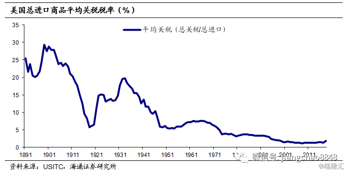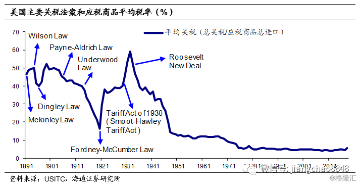 事实上,加关税的做法在美国也不是第一次。早期的美国关税维持在较高水平,是政府收入的主要来源,并且被用来保护国内相关的利益群体。例如1890年《麦金莱关税法案》(Mckinley Law)就是通过提升关税税率到50%,来保护国内的产业免受英国等海外生产者的竞争,1897年《丁格利关税法案》(Dingley Law)又进一步提高关税税率,此后的十多年间,美国的关税总体保持在40%以上的高位。直到20世纪初,随着1913年《安德伍德关税法》(Underwood Law)的通过,美国关税水平才大幅下降。