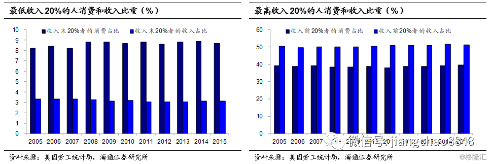 以收入由高到低排序,美国收入在末20%的调查对象,收入占比仅3%,但他们的消费占全部被调查者消费的8%;而收入在前20%的调查对象获得约50%的收入,消费比重仅40%左右。中低收入者整体数量巨大,且对消费贡献的比重更高,但其收入和财富水平限制了其消费的能力,因而贫富差距的不断恶化,不利于整体消费的扩张。